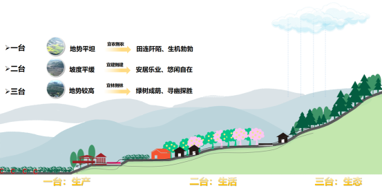 公園城市鄉村表達的美學價值是鄉村資源要素有效匯聚、協同作用、價值創造的系統集成,是居民們文化認同、美學價值、美好生活的關系網絡,具體應體現在公園形態與三大要素的有機結合——以簡陽獨特的三臺式自然丘陵形態特征為基底,結合農業產業和鄉村建筑的表達,構建全新的丘區生產、生活、生態模式,展現簡陽式特色丘區的鄉村美學形態表達。