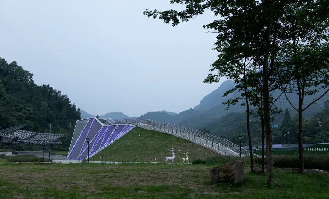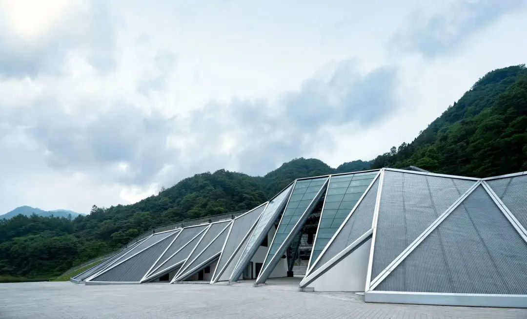 音樂廳順應地形呈一字型擺開,以三角形為元素折疊出類似山的形狀,建筑兩側以覆土綠化的表現手法模擬山體表面,使建筑的山形更加立體化。