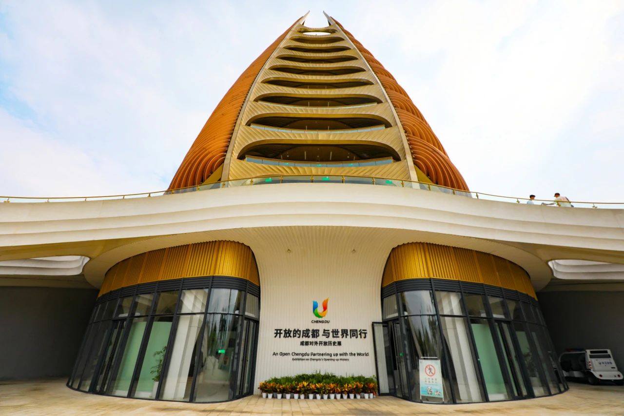 而站在3D熊貓處抬眼看去,便是“竹筍”造型的觀光瞭望塔,塔身底座空間外墻上的成都大運會會徽以及一行“開放的成都 與世界同行”引人矚目——這就是專為大運會而營造的成都對外開放歷史展,用具有藝術美感的展陳方式構筑寫意空間,展示成都藝術性與國際化相得益彰的勃勃生機。