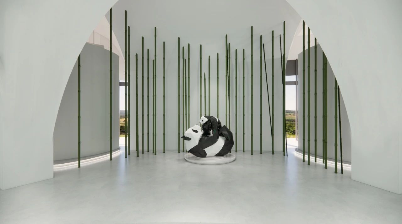 在尾廳處,一大一小兩只大熊貓擁抱組成的趣意動物藝術裝置,與周圍的竹型裝飾融為一體趣味十足。“處于尾聲處,作為東道主,讓熊貓代表成都對各位來賓傳遞美好的祝愿。”鐘艾錦說。