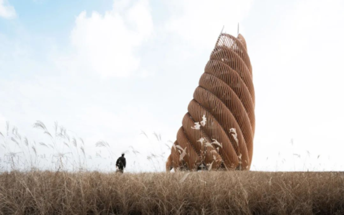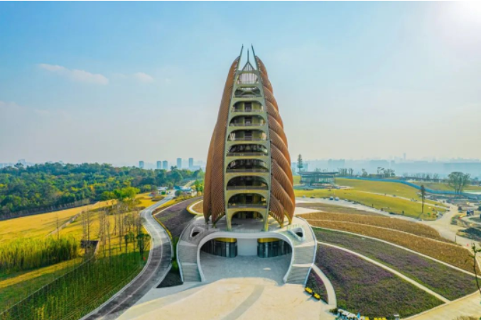 項目以“內外皆風景”作為出發點,不僅成為登高望遠的觀景平臺,更是內外都足以創造引人入勝的美好景觀。瞭望塔造型外部形似“竹筍”,盤旋上升的立面形式對應著內部形似成都市花“芙蓉”的壯觀漫步空間,半開敞的塔身形態創造出景觀視野多變的豐富觀景和漫游體驗。望塔塔冠的幕墻部分可以按照程序設定的角度和速度依次開啟,就像自然界的“春筍發芽”一樣,以對生態更友好、能源更清潔的方式向游客傳達信息,產生互動。