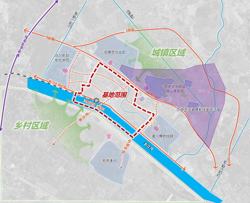 方案基地范圍位于安仁鎮中心區域。基地南側與鄉村區域隔斜江河相望,并處于斜江河、千功一支渠、榿木河等圍合的藍網體系空間內,生態基礎較好;基地北側緊鄰安仁古鎮歷史文化街區核心保護區,周邊文博、文旅與文創資源極豐富。