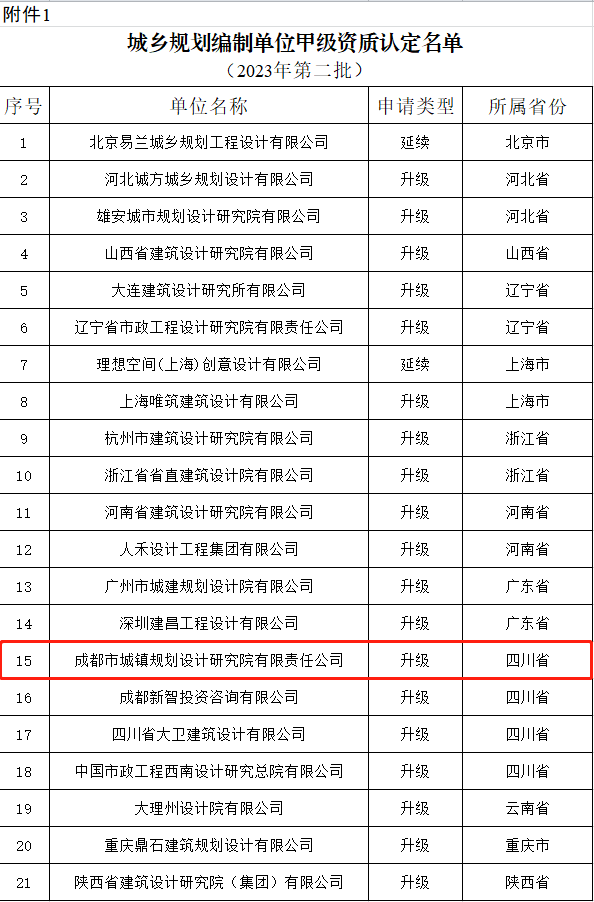 近日,自然資源部發布《關于2023年第二批城鄉規劃編制單位甲級資質認定的公告》,市建筑院下屬成都市城鎮規劃設計研究院有限責任公司順利通過自然資源部審查認定,獲得城鄉規劃編制單位甲級資質!