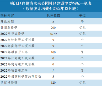 錦江區對標“深圳灣”,通過實施片區開發、蓉深共建、配套先行、定制招商、市場運維,建設數智社區、品位社區、青綠社區融合的未來公園社區,營造“人-自然-科技”共生的場景,將白鷺灣未來公園社區建設成為蓉深聯動發展新模式、成都綠色創新新高地,未來公園社區新樣板。