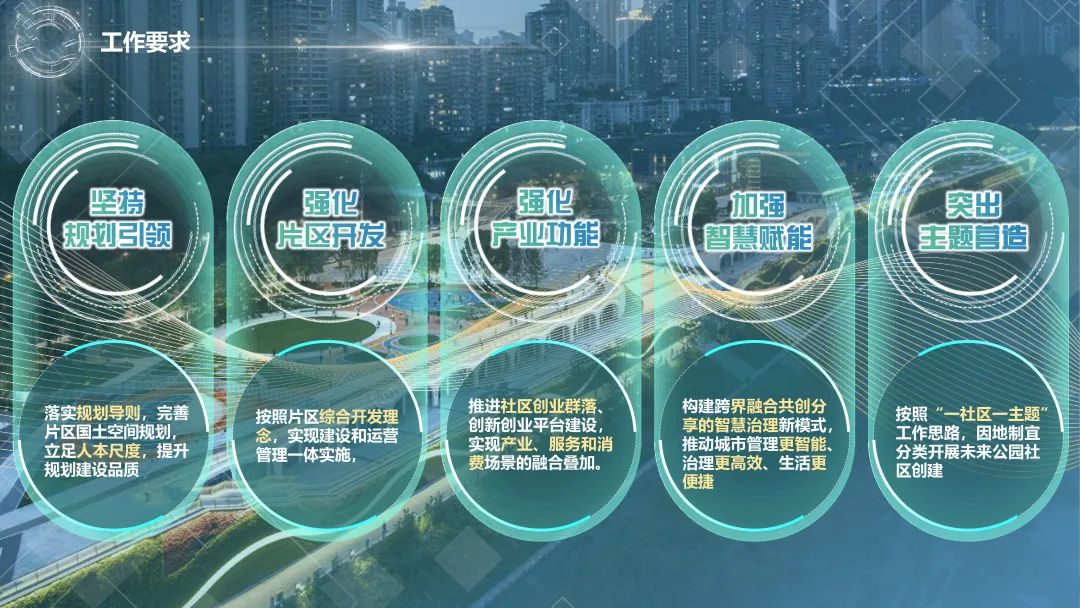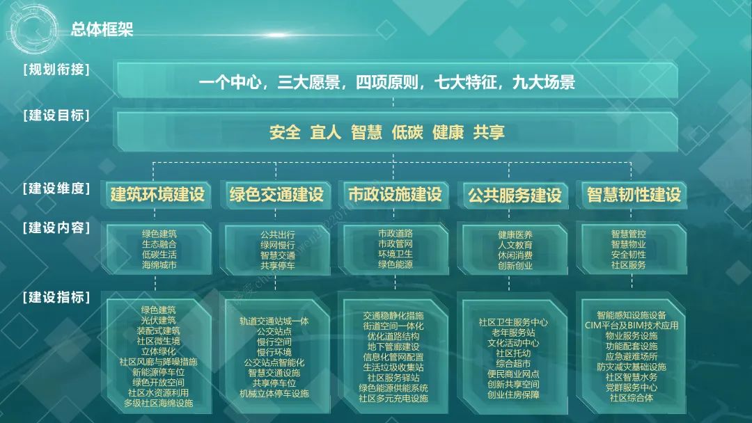 《導則》重點突出街道空間一體化、綠色建筑、軌道交通站城一體、綠色能源供能系統等建設指標,推動城市空間結構、產業結構、交通結構、能源結構調整。綠色建筑、裝配式建筑、新能源停車位、多級社區海綿設施等建設指標已納入新出讓地塊建設條件,相關約束性內容已納入建設項目施工圖審查范圍,規范指引未來公園社區項目設計和建設。