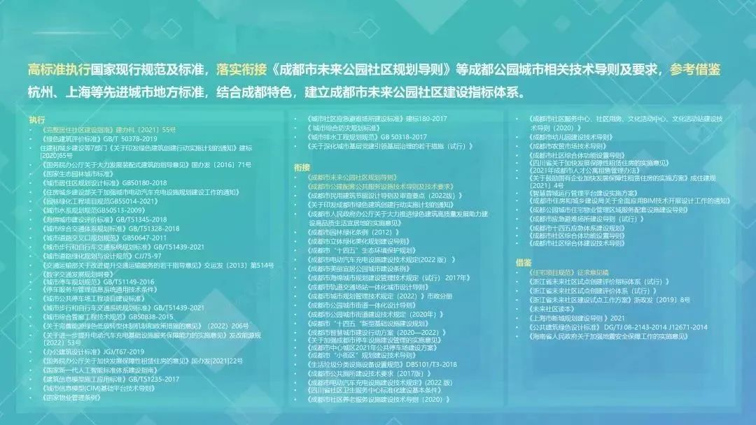《導則》根據成都市未來公園社區“一個中心、三大愿景、四項原則、七大特征、九大場景”總體思路,研究借鑒住房城鄉建設部完整社區、自然資源部社區生活圈、國家發改委低碳社區、浙江未來社區等標準體系,鏈接成都公園城市相關技術導則及要求,圍繞“安全、宜人、智慧、低碳、健康、共享”6大目標,構建形成極具成都公園城市特色的“5+20+44”指標體系。