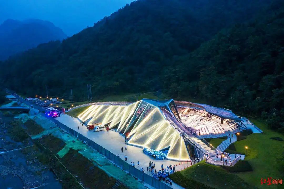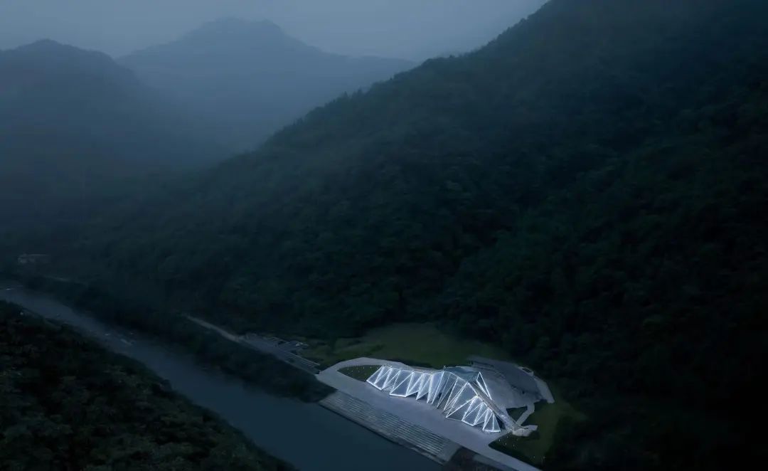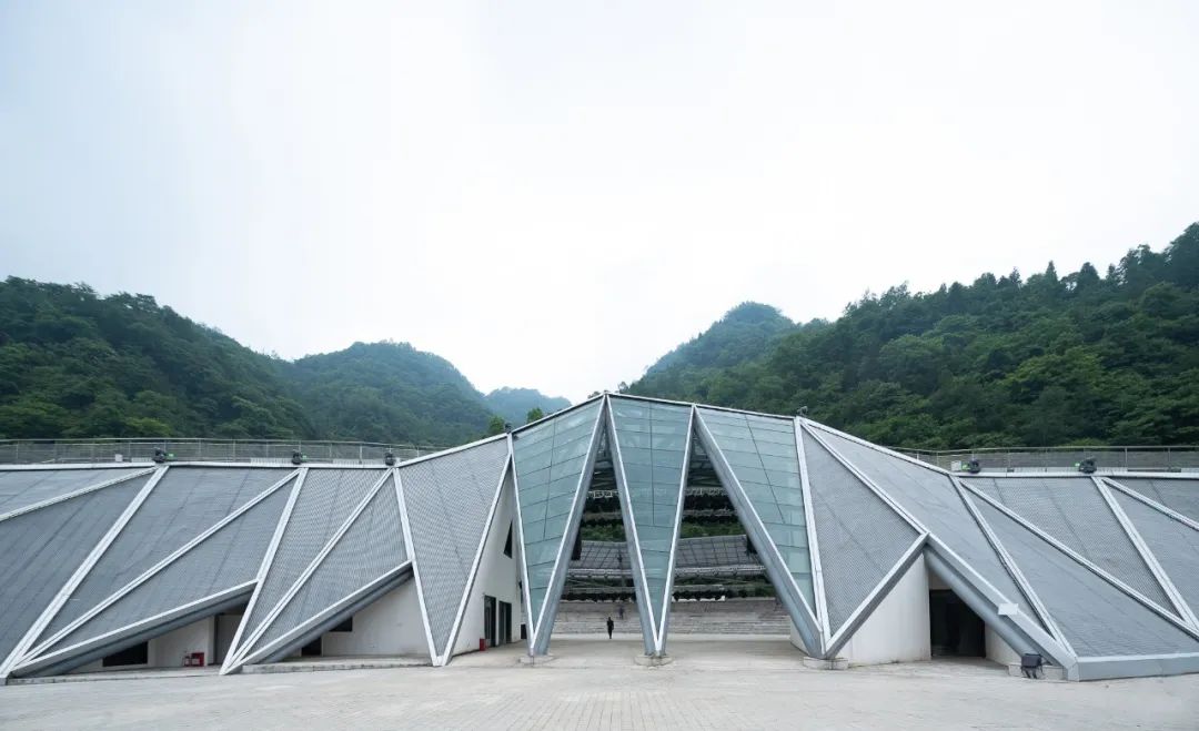 音樂廳順應地形呈一字型擺開,以三角形為元素折疊出類似山的形狀,建筑兩側以覆土綠化的表現手法模擬山體表面,使建筑的山形更加立體化。