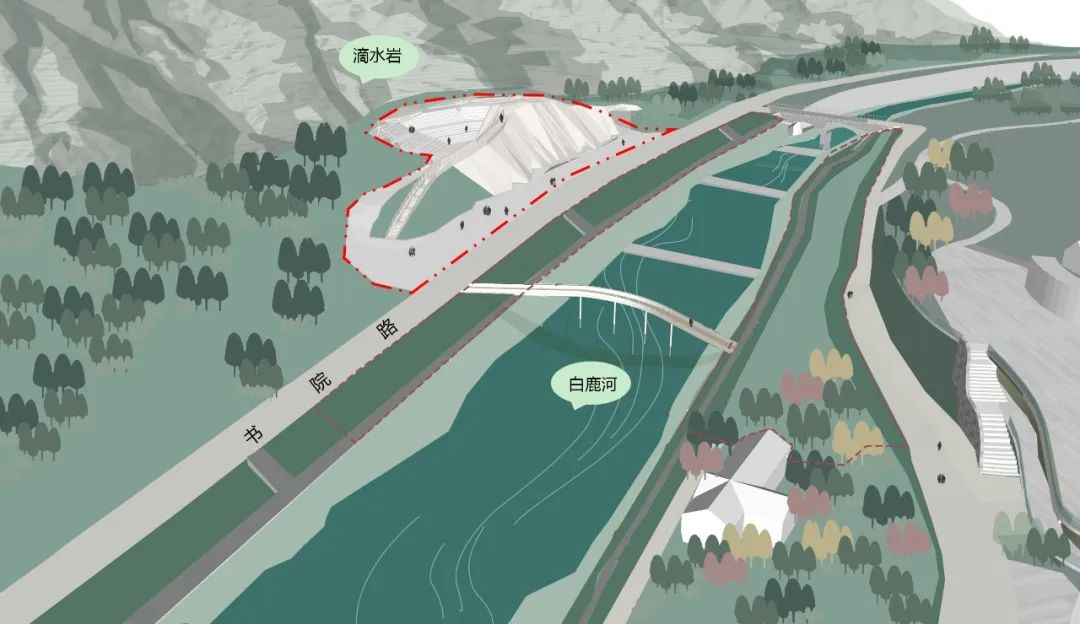 本方案立足強化河流與小鎮的對話,旨在延伸演藝藝術活力軸,創造積極的空間環境與音樂價值。設計構思來源于“山”,設計理念是讓建筑與白鹿自然風景融為一體、完美結合,讓觀眾在回歸自然的森林式音樂廳中聆聽自然、享受音樂、感受美景。