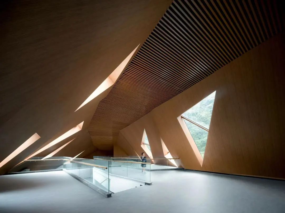 不僅空間結構上呼應山體的形狀,更是在建筑入口、舞臺處也做了相應的詮釋。建筑的入口在尺度、形狀和人的感受方面,也是模擬山洞的感覺——洞口上窄下寬,時窄時寬,進洞別有洞天;舞臺上方的玻璃體以倒三角的形勢存在,行走在舞臺內外會感受到猶如穿越峽谷的空曠、幽靜、縹緲感。