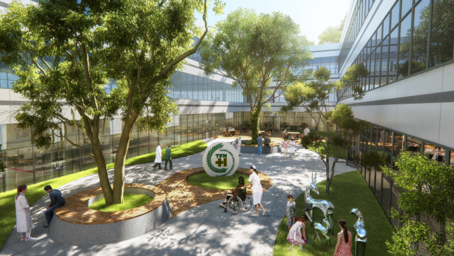 天府新區人民醫院遷建項目將城市友好性與功能實用性高度結合,結合城市空間和街道一體化打造,既保證了醫院使用的功能性,也和公園環境和諧統一;將醫院綠地與西側市政公園一體化打造,院區內各類人群可便捷到達。公園服務于社會公眾的同時,也可成為院區的療愈花園,成為一個面向公眾開放共享的城市公共節點。