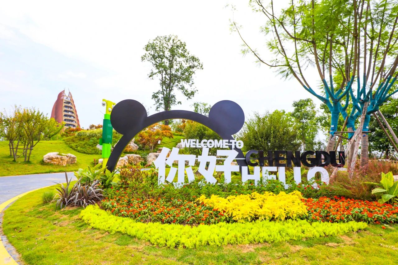 走進熊貓商業街通往觀光瞭望塔的入口環島,黑白配色的中英雙語歡迎語盡顯成都熊貓文化。