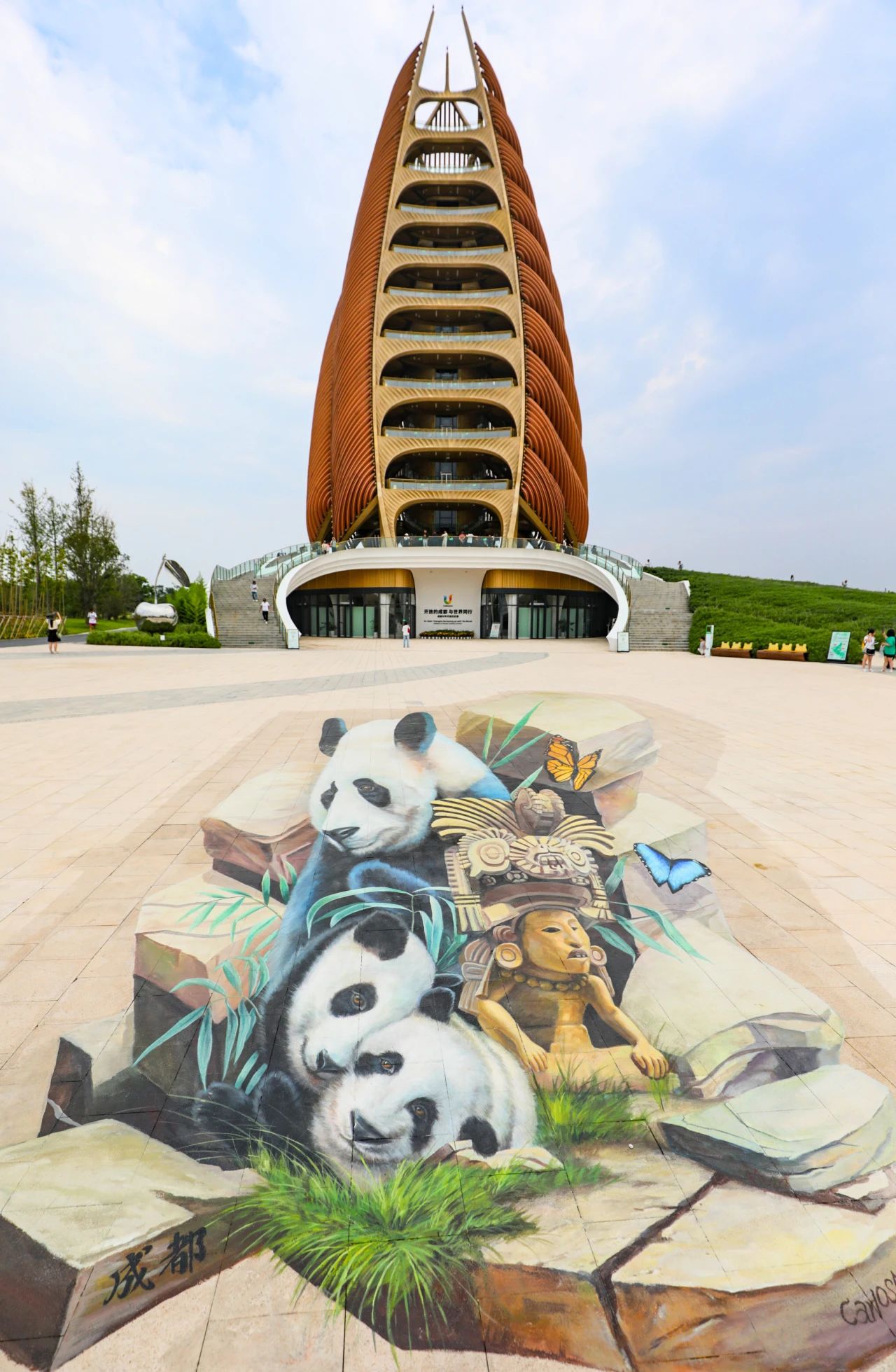 來到觀光瞭望塔前廣場,一副來自墨西哥瓜達拉哈拉的3D熊貓令人驚喜:三只大熊貓和極具墨西哥文化特色的人物形象,一同坐臥在三面圍石的草叢里。創作者Carlos Alberto Garcia Hemandez將遠隔重洋、各具民族風格的形象放在同一作品中,畫面卻又顯得異常和諧,引來游客紛紛駐足。